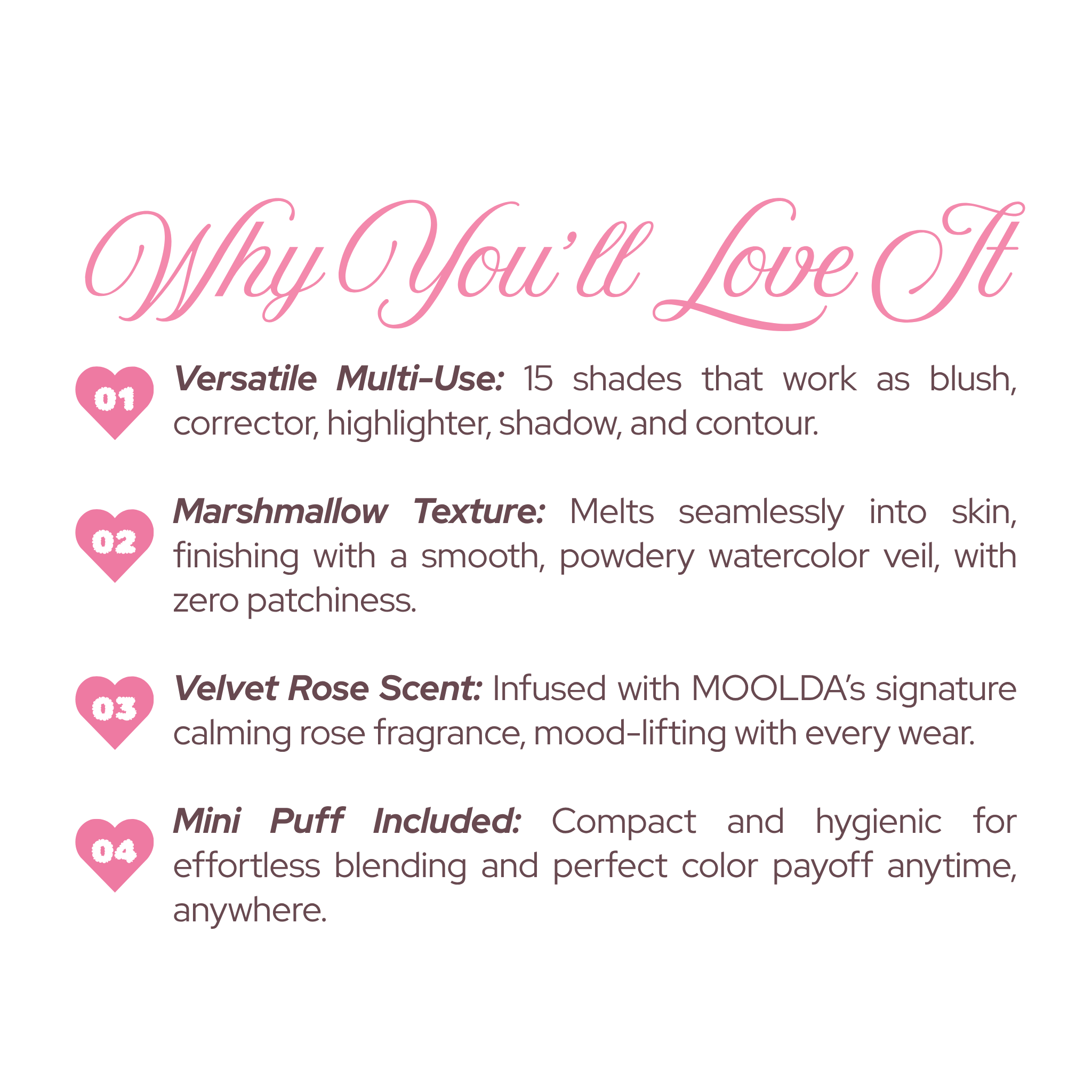 The MOOLDA Moisture Veil Multi Use Blush glides on with a soft, marshmallow-like texture that melts seamlessly into your skin. Designed for versatility, this multi-use blush effortlessly transforms into a highlighter, contour, eyeshadow, or lip tint, giving you the freedom to create your look, your way. Build it up, blend it out, glow up your way.